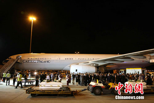 中新社香港8月25日電(梁今 胡娜 梁君艷)在菲律賓劫持人質事件中八位香港遇難者的靈柩,25日晚由港府包機從馬尼拉送返香港。