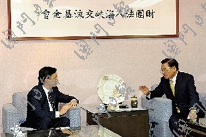 譚俊榮二十四日下午在臺(tái)北禮節(jié)性拜會(huì);鶗(huì)董事長(zhǎng)江丙坤,受到熱情接待。雙方深入交換了深化澳臺(tái)關(guān)系發(fā)展,促進(jìn)兩地文化、觀光、旅游、經(jīng)濟(jì)等交流的意見(jiàn)。江丙坤明確表示,支持特區(qū)政府推動(dòng)澳臺(tái)關(guān)系發(fā)展。愿意發(fā)揮海基會(huì)的作用和影響力,協(xié)助特區(qū)政府與臺(tái)灣有關(guān)方面磋商在臺(tái)設(shè)立辦事處及澳門高校學(xué)歷認(rèn)可等事宜。