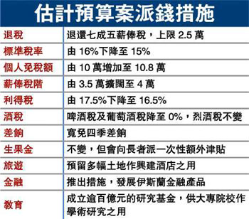 至于全港納稅人士預(yù)料今天也會(huì)收到喜訊。消息指,曾俊華將會(huì)在預(yù)算案中提出多項(xiàng)優(yōu)惠納稅人的措施,包括增加免稅額、擴(kuò)闊稅階和退稅等。退稅方面,消息指政府將退還七成五薪俸稅,上限為二萬五千元;而個(gè)人免稅額則回復(fù)至○二/○三年水平,由十萬元增加至十萬零八千元。薪俸稅標(biāo)準(zhǔn)稅率方面,由現(xiàn)時(shí)的一成六,降低至一成五;稅階則由三萬五千元擴(kuò)闊至四萬元,惟邊際稅率可能維持不變。而為了增加營(yíng)商競(jìng)爭(zhēng)力,利得稅亦可能會(huì)相應(yīng)調(diào)低一個(gè)百分點(diǎn),至百分之十六點(diǎn)五。