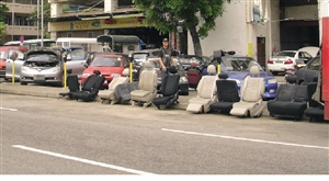 將座椅地氈?jǐn)[車頂、路邊,成修車行一帶新景觀。(圖片來源:澳門日報)