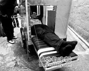 記者在策展人鐘宏亮引領下參觀了整個展覽,發(fā)現(xiàn)了不少充滿新意的作品。在女子監(jiān)獄外的名為《工作/空間/再工作/時間》的作品儼然一棟房子,但全部由一塊塊黑色薄木板拼建成,透過木板間的間隙可以看到建筑里的人在活動,而整個建筑又相當結(jié)實,人可以從“樓梯”登上房子的二樓。名為《流浪家居》的作品,作者甚至設計了一輛“房車”,不過是流浪者的“房車”,由自行車帶動,“房車”麻雀雖小,五臟俱全,里面有窗有門,有柜子有凳子,通過拼接還可以組成一張床,作者現(xiàn)場向大家講解時還興奮地拼起床躺了下來。(馮悅)