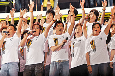 沒人歡呼,沒人揮動熒光棒,萬人聚集在一起,并不是欣賞精彩表演,為的只是告訴臺灣受臺風吹襲的災(zāi)民,他們在困境中并不孤獨;為的只是從心中呼喊一聲:“臺灣加油!”
