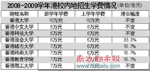 香港浸會大學(xué)內(nèi)地本科生學(xué)費從去年的6萬港元增至8萬港元,增加超過三成。而香港教育學(xué)院、香港嶺南大學(xué)的學(xué)費標(biāo)準(zhǔn)也由每年6萬港元升到7萬港元。目前已經(jīng)公布今年內(nèi)地招生計劃的高校中,也有高校的收費標(biāo)準(zhǔn)維持不變,如香港大學(xué)、香港中文大學(xué)、香港科技大學(xué)、香港理工大學(xué)。但是,香港大學(xué)將內(nèi)地生預(yù)繳費用從1.5萬港元增至3萬港元。