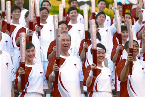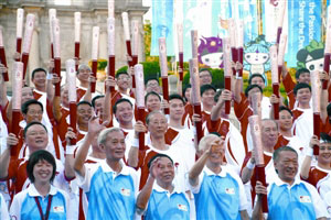 澳門火炬手展?fàn)N爛笑容 大合照贈北京奧組委(圖)