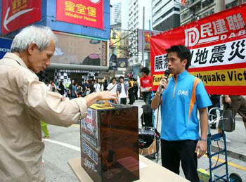 多個政黨、團體和商業(yè)機構(gòu)均以不同方式參與賑災(zāi)行動,包括街頭和商場義賣、獻(xiàn)唱、大球場義賽等,市民紛紛慷慨解囊,祈求為災(zāi)民獻(xiàn)出一分力。