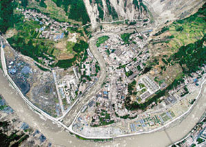 傍晚5時30分,飛機(jī)飛抵汶川縣映秀鎮(zhèn)上空,記者在機(jī)組人員的幫助下,打開機(jī)艙門,向外張望,發(fā)現(xiàn)整個鎮(zhèn)子已經(jīng)變?yōu)橐黄瑥U墟,只有少數(shù)的工廠外墻還在堅強(qiáng)地佇立著!斑@里是地震的中心地帶,相反汶川縣城卻沒有那么嚴(yán)重的,只是道路不通影響救援而已!