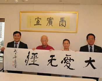 在這個“愛心書畫義賣區(qū)”內(nèi),最矚目的是國學大師饒宗頤教授親筆所寫的“大愛無疆”,這四個大字已被香港潮屬總會名譽會長高佩璇居士以500萬港元義購,可謂一字百萬金。在這里,最珍貴的不是這些字,也不是這筆捐款,而在于它帶來的情感上的震撼,一種骨肉相連、發(fā)自肺腑的真情。