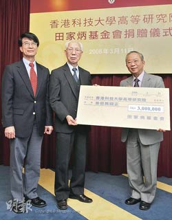 據(jù)香港媒體報(bào)道,田家炳基金會(huì)捐款300萬(wàn)元給科大高研院,加上政府的配對(duì)基金,成立600萬(wàn)元的“田家炳教育基金”。基金會(huì)主席田家炳、科大校董會(huì)主席陳祖澤及校長(zhǎng)朱經(jīng)武11日出席了捐贈(zèng)鳴謝儀式。