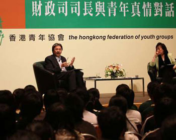 中新網(wǎng)3月18日電 據(jù)香港大公報(bào)報(bào)道,香港財(cái)政司司長(zhǎng)曾俊華17日獲邀與青少年面對(duì)面真情對(duì)話,全程展現(xiàn)其親民的一面。他以制定財(cái)政預(yù)算案的三個(gè)理財(cái)信念,即社會(huì)承擔(dān)、可持續(xù)性和務(wù)實(shí)態(tài)度,勉勵(lì)青少年要為自己制訂個(gè)人發(fā)展目標(biāo)。學(xué)生整體滿意曾俊華的表現(xiàn),給予他9分的高評(píng)分。