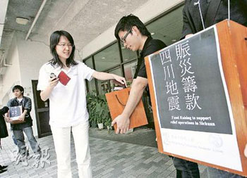 中新網(wǎng)5月15日電 據(jù)香港明報報道,四川災(zāi)情嚴峻,港人紛紛捐款賑災(zāi),短短兩日,中聯(lián)辦已收到香港各界逾1.3億元捐款。不同界別各出其謀籌款,香港教育界呼吁全港所有中小學(xué)生捐10元、教師捐100元賑災(zāi)。