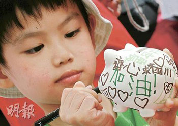 此外,海港城亦舉行慈善義賣,市民捐款50元,即可獲得白瓷錢罐,畫上對災民的祝福。而22日起,將發(fā)售印有小朋友畫作及對四川災民祝福語句的T恤,每件售150元。