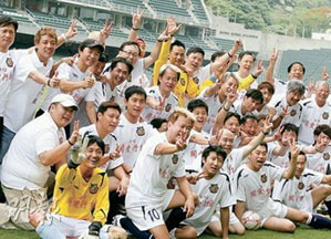 香港不少團體18日為四川地震災民籌款,明星足球隊(圖)在大球場舉行慈善賽,與由警隊“一哥”鄧竟成助陣的足總邀請隊友賽。(圖片來源:明報)