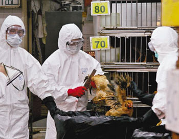 六月十一日,香港食環(huán)署人員穿著保護袍服到街市圍封活家禽零售點。漁護署當天宣布由于在深水埗等四個街市的雞只樣本,化驗出H5N1病毒呈陽性反應,因此決定于全港街市屠殺活家禽。漁護署表示,病毒源頭不排除是走私雞。 中新社發(fā) 譚達明 攝
