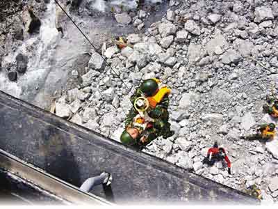 31日早上11時17分,一架編號為B-4125的直升機載著中尉彭兵等6名空降兵前去營救。他們帶著兩天的干糧和水,從直升機索降到一塊狹小地帶,開始搜尋受傷礦工。歷經(jīng)4個多小時搜尋,終于找到兩名受傷礦工,對他們進行了消毒和簡單包扎,并用擔架將他們抬到幾千米外直升機能夠營救的地點。