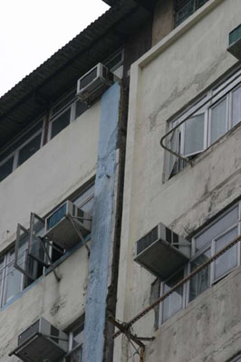 現(xiàn)場為大角嘴橡樹街九十號(hào)橡樹樓,樓高十一層,有三十四年樓齡,與隔鄰的廣和大樓緊貼。據(jù)街坊表示,兩幢大廈之間在大約二十年前,已出現(xiàn)一條明顯裂縫,但未有發(fā)現(xiàn)大廈結(jié)構(gòu)出現(xiàn)問題。