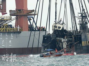 另有消息傳出廣州打撈局人員在晚上8時進行打撈工序期間,在沉船拖纜機左右兩邊先發(fā)現(xiàn)2具尸體,其后在船艙再發(fā)現(xiàn)2具尸體,但由于暫時不適合搜救,所以港方搜救人員暫未將尸體撈起。