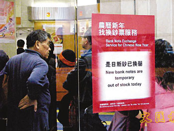 匯豐及恒生銀行發(fā)言人稱,會(huì)在個(gè)別人流較多的分行設(shè)立專柜,將服務(wù)分流。金管局發(fā)言人拒絕透露新年前加印新鈔數(shù)量,只稱各面額鈔票都會(huì)加印,數(shù)量與去年相若。資料顯示,去年新春金管局加印了5000萬(wàn)張10元膠鈔應(yīng)市。