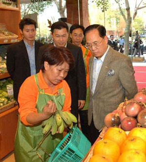 中新網(wǎng)1月8日電 香港新生精神康復(fù)會(huì)在愉景灣開(kāi)設(shè)的第五間“新生農(nóng)社”7日舉行開(kāi)幕禮,香港特首曾蔭權(quán)席并聽(tīng)取職員介紹該處售賣(mài)的有機(jī)食品。