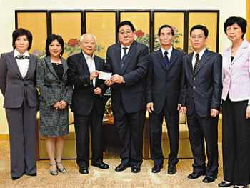 李東;鹩邢薰15日慨捐1000萬,由李東海與兒子李君豪一起遞交了善款支票。 有近8年時間住在四川的香港知名工業(yè)家蔣震,在兩個女兒陪同下到中聯(lián)辦捐出1000萬元的支票。