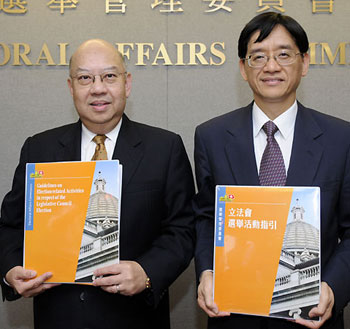 香港選舉管理委員會主席彭鍵基(左)公布立法會選舉活動指引,并促請候選人熟讀指引。(圖片來源:香港特區(qū)政府網(wǎng)站)