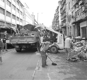 清潔工人利用大型機械及車輛移走垃圾。(圖片來源:澳門日報)