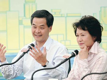 行政會議成員梁振英(左)近日經(jīng)常談及香港面對兩岸三通時的挑戰(zhàn)和機遇,他9日在《城市論壇》中認為香港官員應加強與臺灣官員交流。右為香江文化交流基金會主席江素惠。(圖片來源:明報)