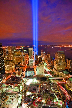 10日晚,紐約市用激光束“重現(xiàn)”世貿中心。