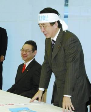 在和長谷川市長交談前,菅直人頭上系了一條寫有“歸還北方四島”的頭巾,表達(dá)對此事的強硬態(tài)度。