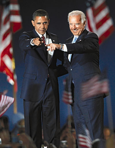 在芝加哥的慶祝大會(huì)上,奧巴馬與副手拜登開(kāi)心與支持者互動(dòng)。