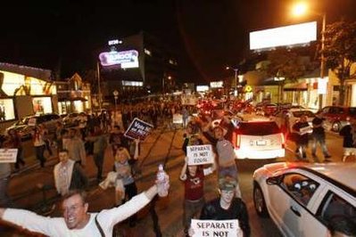 中新網(wǎng)11月6日電 綜合報(bào)道,加州數(shù)千名同性戀權(quán)利擁護(hù)者當(dāng)?shù)貢r(shí)間5日走上街頭,抗議加州通過(guò)的禁止同性婚姻提案。