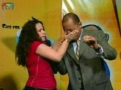 這位剽悍的紅衣女子,是與委內(nèi)瑞拉總統(tǒng)查韋斯同黨的國(guó)會(huì)議員薇瑞拉(Iris Varela)。一旁身穿灰色西裝的則是政論節(jié)目記者阿佐卡爾(Gustavo Azocar)。20日的現(xiàn)場(chǎng)節(jié)目中的激烈打斗讓全委內(nèi)瑞拉的觀眾目瞪口呆。