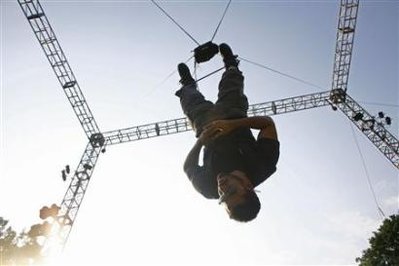 三十五歲的戴維布萊恩,自前天起僅靠一條纜線,垂吊在沃曼溜冰場高聳的大型金屬架下。他除了喝水和身體檢查等例行休息時間會回復(fù)直立狀態(tài)數(shù)分鐘外,其余時間均保持倒吊。