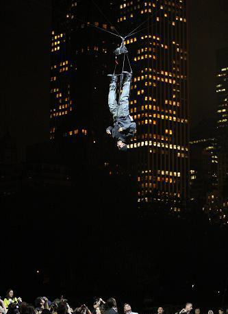 表演結(jié)束之后,戴維布萊恩再送給魔術(shù)迷另一個表演,他從十三點四公尺高的金屬架頂向下墜落,短暫擺蕩后又急速往上升,接著就消失在公園上方的夜空中。