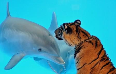 中新網(wǎng)3月7日電 據(jù)英國(guó)《每日郵報(bào)》報(bào)道,當(dāng)海豚遇上老虎?這樣的相遇似乎很少見(jiàn),但是在美國(guó)加利福尼亞六旗探索王國(guó)游樂(lè)園,一只寬吻海豚竟然和一只孟加拉老虎一見(jiàn)傾心,海豚還以吐泡泡的方式向小虎問(wèn)好。