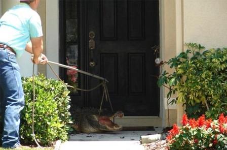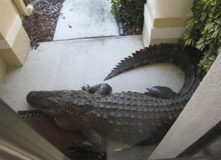 中新網(wǎng)4月29日電 據(jù)英國媒體報(bào)道,日前在佛羅里達(dá)州郊區(qū)的一家住戶門外驚現(xiàn)一條長達(dá)11英尺的鱷魚,這家主人被困屋內(nèi)緊急報(bào)警,野生動物專家用了一個(gè)小時(shí)才把這位“不速之客”請走。