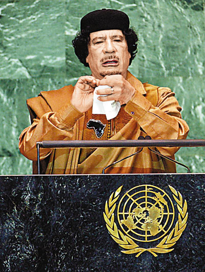 但對于一名與會者,這熱鬧早在他抵達紐約之前的一個月就已經開始了,這個人就是利比亞領導人卡扎菲?ㄔ平^對不乏制造熱鬧的資本,他頭上并沒有頂著總統(tǒng)或總理的頭銜,人們常常用他的軍中官銜上校來稱呼他,但他卻是利比亞的實權領袖。
