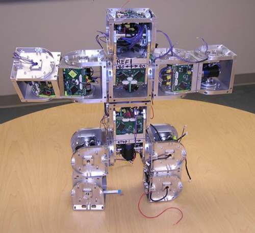 南加州大學多形態(tài)機器人學實驗室兩年多前開始研發(fā)這款“超級機械人”(Superbot)。它是由一百塊模塊組成,目前僅完成了頭二十塊。它雖然不能真的像《變形金剛》電影中的機械人那樣變成貨車或“F-22”戰(zhàn)斗機,但它的變身能力仍令人咋舌:它可以“長出”一對、兩對或三對“腿子”,可以像蛇那樣滑行,也可以像毛蟲那樣蠕動。其中六塊模塊可以形成履帶,有些組合還可以舞動繩子。研究主管沈偉明(音譯)稱:“它要攀爬時可以長出腿子,要下山時則可以變成球狀或者索性滾下去!迸c賓夕法尼亞大學去年展出的模塊機械人相似,它解體后能夠自我修復和自我重裝:每個模塊儼如一個獨立的機械人,而且可以利用紅外線和無線電訊息互相“對話”;它們又會一直評估周遭情況,包括附近有沒有其它模塊,以及它們本身是否需要變成手腳。