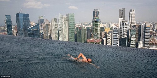 報(bào)道稱,建在樓頂?shù)挠境乜雌饋砣缤嫜由斓降仄骄一般壯觀。你可以一邊游泳,一邊俯瞰新加坡靚麗的城市風(fēng)光。從泳池溢出的水會滲入到特別設(shè)計(jì)的集水區(qū),并通過水泵和水處理系統(tǒng)重新回到泳池中。