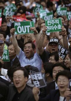 由反對(duì)黨領(lǐng)導(dǎo)的示威群眾指責(zé)李明博要求對(duì)韓國(guó)前總統(tǒng)盧武鉉的調(diào)查帶有政治動(dòng)機(jī)。示威者高喊“李明博應(yīng)該道歉”等口號(hào)。