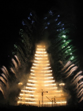看點二是“強(qiáng)盛大國的火花”、“我們將勝利”兩場煙火晚會。4月14日晚,一場旨在紀(jì)念金日成主席誕辰97周年、宣誓邁向強(qiáng)盛國家的煙火表演照亮了平壤的夜空。隨著聲聲炮響,五顏六色、造型各異的美麗煙火依次騰空,把大同江上下游兩座橋之間的區(qū)域變成了煙火的海洋。朝鮮最高領(lǐng)導(dǎo)人金正日同志的出場令全場氣氛格外高漲,掌聲和歡呼聲回蕩在大同江的兩岸。有意思的是,13日、15日平壤下了兩場春雨,唯獨14日萬里晴好,給煙火表演留下了完美的時間窗口。5月1日在柳京大廈舉行的焰火晚會更具特色,巨大的樓體第一次流光溢彩,散發(fā)出美麗的火光,那神奇的景象讓人難忘。