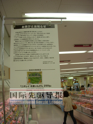 冷凍食品柜臺前,立著一個告示牌,“請購買了冷凍豆角的客人一定不要食用。給大家添麻煩了,請買了該食品的客人來退貨”。超市工作人員正忙著攀上梯子,掛起新的宣傳牌,“有這樣白綠相間標志的都是國內工廠制造,請放心食用”。