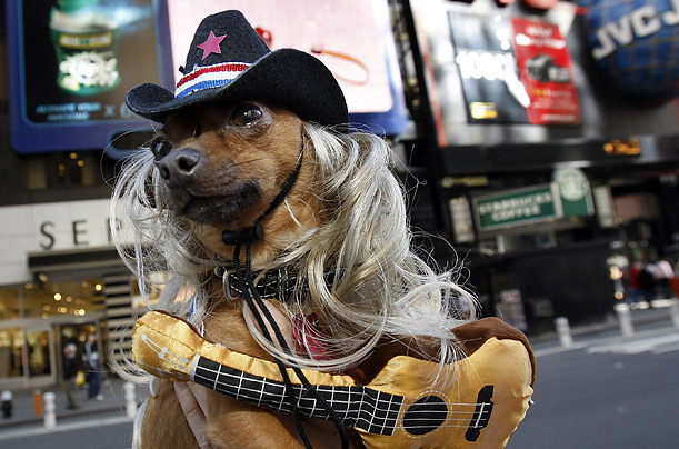 圖片四:沒聽說過“赤裸牛仔”么?那你可要落伍了!“赤裸牛仔”可是時(shí)代廣場(chǎng)最有名的人物之一。這不,連這個(gè)吉娃娃都是他的忠實(shí)粉絲,打扮成他最紅火時(shí)流浪歌手的模樣。(鐘巖)