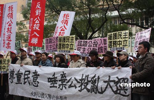 臺灣“中央選舉委員會”將從2月27日起主辦十場“入聯(lián)公投”、“返聯(lián)公投”意見發(fā)表會或辯論會,14日是反方代表申請期限。臺灣勞動黨主席吳榮元、民主行動聯(lián)盟總召集人黃光國到“中選會”遞交公投反方代表申請書,他們還率領“反公投入聯(lián)行動聯(lián)盟”成員在“中選會”前表達訴求,群眾高舉“反對公投入聯(lián),拒領公投票”等標語,主張拒領公投票,要求中國國民黨與民主進步黨拋棄“公投入聯(lián)”、“公投返聯(lián)”議題。中新社發(fā) 耿軍 攝
