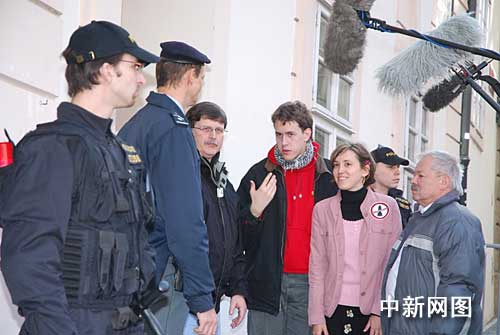 “對(duì)基地說(shuō)不”組織負(fù)責(zé)人馬伊切克(右4) 向美國(guó)大使館交涉,聲稱要向美國(guó)政府送交伊朗戰(zhàn)爭(zhēng)物證。