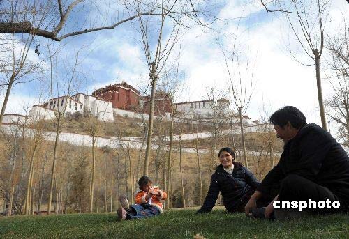 3月20日,拉薩市一個(gè)三口之家在布達(dá)拉宮下的宗角祿康內(nèi)休閑娛樂。