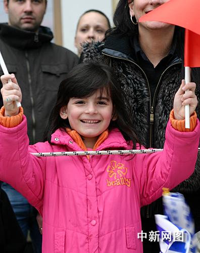 3月25日,北京2008年奧運圣火希臘傳遞第二天,慶典儀式在終點約阿尼納舉行。市民高舉中國和希臘國旗歡迎北京奧運圣火到來。中新社記者 王歡