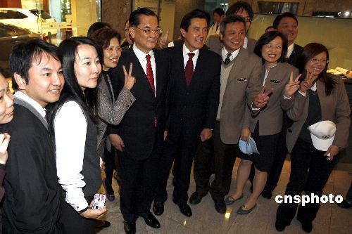 臺灣地區(qū)領(lǐng)導(dǎo)人當選人馬英九上午拜會中國國民黨榮譽主席連戰(zhàn)。會后和工作人員與市民一起合影。中新社發(fā) 杜洋 攝