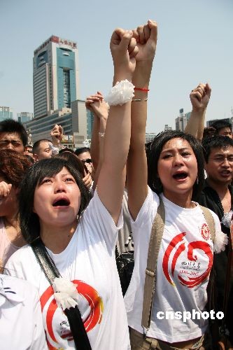 5月19日14時28分,成都天府廣場,數(shù)以萬計的民眾自發(fā)聚集在一起默哀,為在四川汶川地震中遇難的同胞哀悼、祈禱,之后,萬人高喊“雄起”!