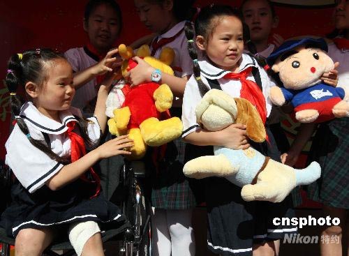 五月三十日,來(lái)自四川地震災(zāi)區(qū)北川小學(xué)的雙胞胎姐妹席大雙(右)、席小雙來(lái)到北京一所學(xué)校與這里的師生共度六一兒童節(jié),享受節(jié)日的快樂(lè)。學(xué)生們?yōu)樗齻兯蜕狭嗽S多節(jié)日的禮物。中新社發(fā) 任海霞 攝