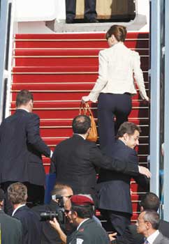 薩科齊的妻子布呂尼花容失色,搶在丈夫前頭登機(jī)。